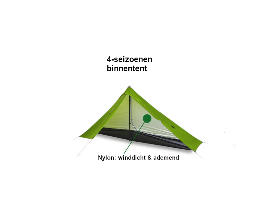 De 4-seizoenen binnentent is vervaardigd uit hoogwaardig 15D nylon, gecombineerd met B3 mesh. Dit zorgt voor een goede warmte-isolatie, met afdoende ventilatie, ook bij koudere dagen en nachten. Hiermee is de tent geschikt voor alle 4 de seizoenen, al kan de tent wat warm aanvoelen bij echt hogere temperaturen in de zomer.
