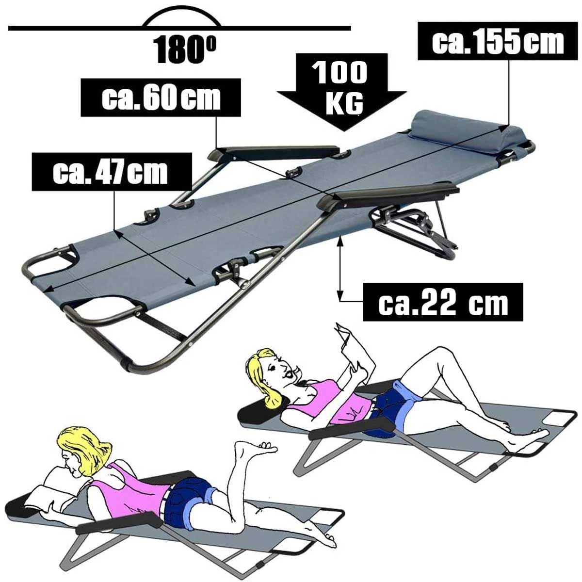 De campingstoel kan snel worden omgebouwd tot een wellnessbank. Als hij is opgeborgen, neemt de Zonnebank erg weinig ruimte in beslag. Dankzij het lichte gewicht kunt u het ligbed snel op de gewenste locatie plaatsen en genieten van een ontspannende pauze. Of het nu in het openluchtzwembad is, op het strand, aan het meer of om te relaxen in het zwembad, de vrijetijdsligstoel is perfect geschikt voor al deze gelegenheden en zorgt voor een unieke sfeer van welzijn.