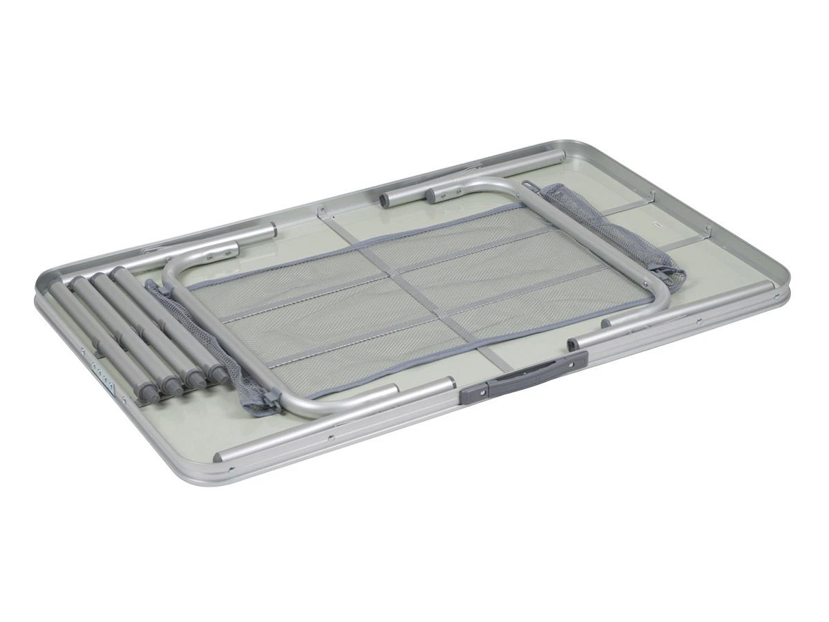 De tafel is voorzien van een lichtgewicht aluminium onderstel en een aluminium tafelblad. De tafel is dus water- en hitte bestendig!