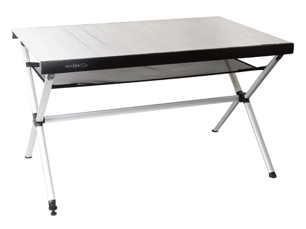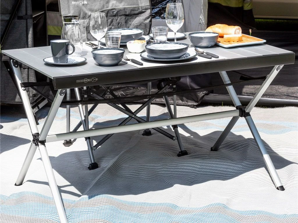 De Brunner Accelerate 4 biedt plaats aan vier personen en draagt tot wel 30 kg. De tafel is 71 cm hoog, waardoor u uw benen er gemakkelijk onder kwijt kunt. Deze lichtgewicht campingtafel komt met een aantal handige extraatjes. Hij heeft een ingebouwde waterpas, zodat u kunt zien of hij helemaal recht staat. Staat hij dat niet? Dan kunt u de in hoogte verstelbare poot tot 2 cm uitdraaien om hem stabieler neer te zetten op een oneven ondergrond. Ten slotte hangt er onder de tafel een net voor extra opbergruimte. Dat bespaart weer wat ruimte op uw tafel!