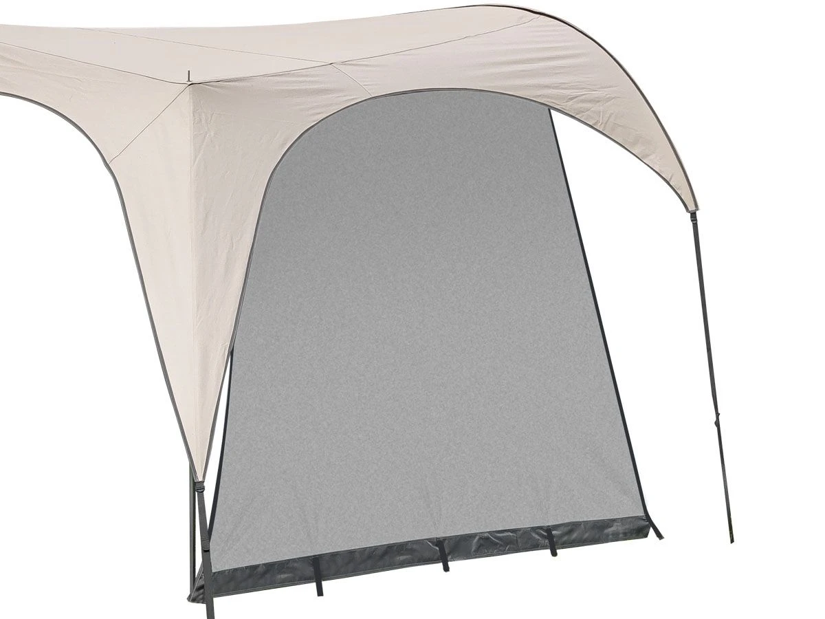 Deze handige zijwand kan zowel aan de linker- als rechterzijde van de Travelling luifel bevestigd worden. Aan de bovenzijde zitten handige haken waarmee de zijwand aan de ligger van het luifelframe bevestigd kan worden. Aan de onderzijde kun je de zijwand vastzetten met haringen.