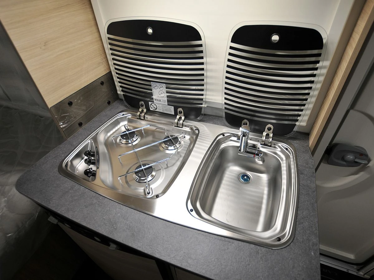 -Keuken en Faciliteiten: De caravan is uitgerust met een moderne keuken voorzien van een kookplaat, wasbak en voldoende opbergruimte voor keukengerei. De Caravelair Alba 390 biedt naast een functionele keuken ook praktische opbergruimtes voor al je kampeerbenodigdheden, zodat je alles hebt wat je nodig hebt voor een aangename vakantie.