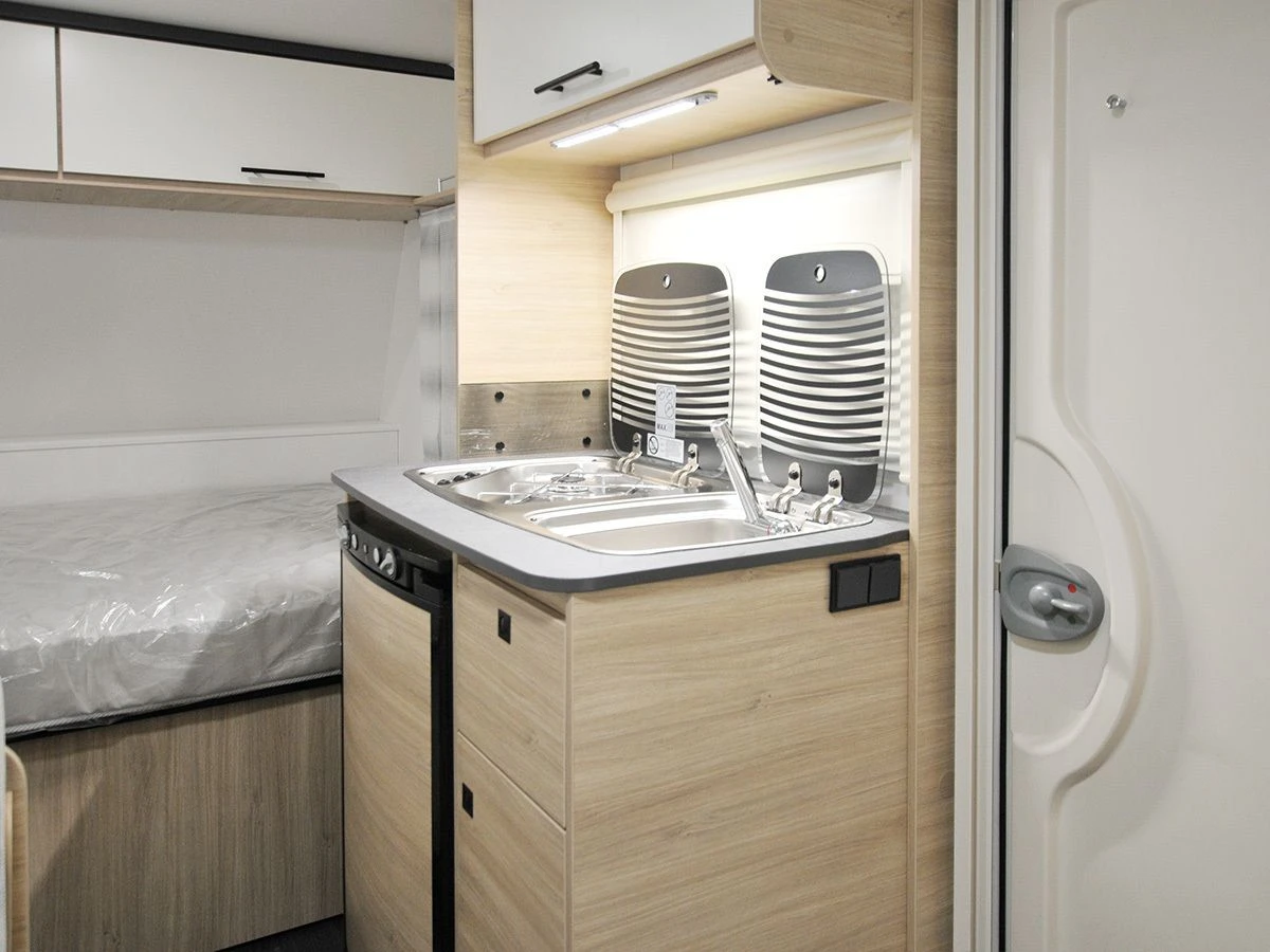 | Caravan indeling | Achter toilet, Middenkeuken, Slaapbank, Treinzit, Vast bed |