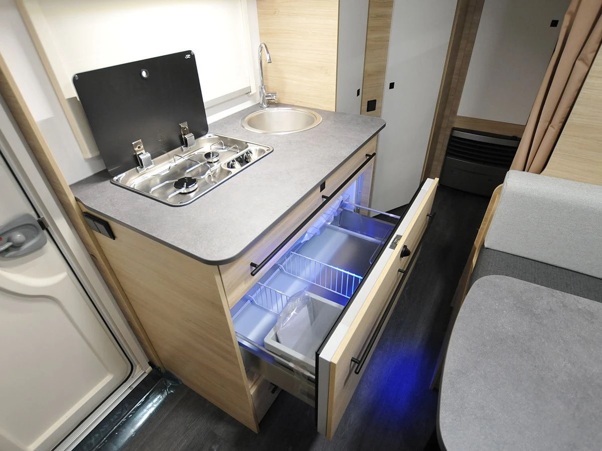 Achterin de caravan vindt u een royale toiletruimte met draaibaar cassette toilet en een douchebak. In de keuken tegenover de treinzit vindt u o.a. een Compressor koelkast XL Freeze van 150 liter en een 3-pits kooktoestel en spoelbak uit RVS met een glazen afdek voor meer werkruimte.