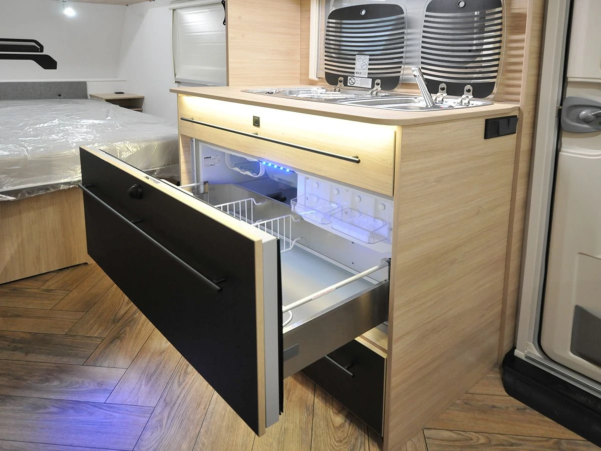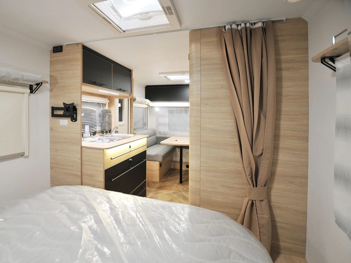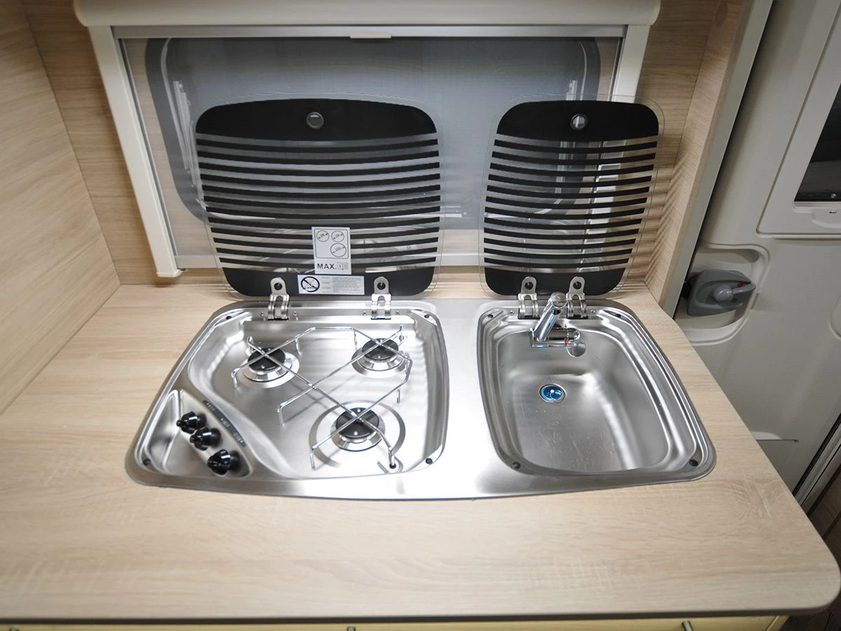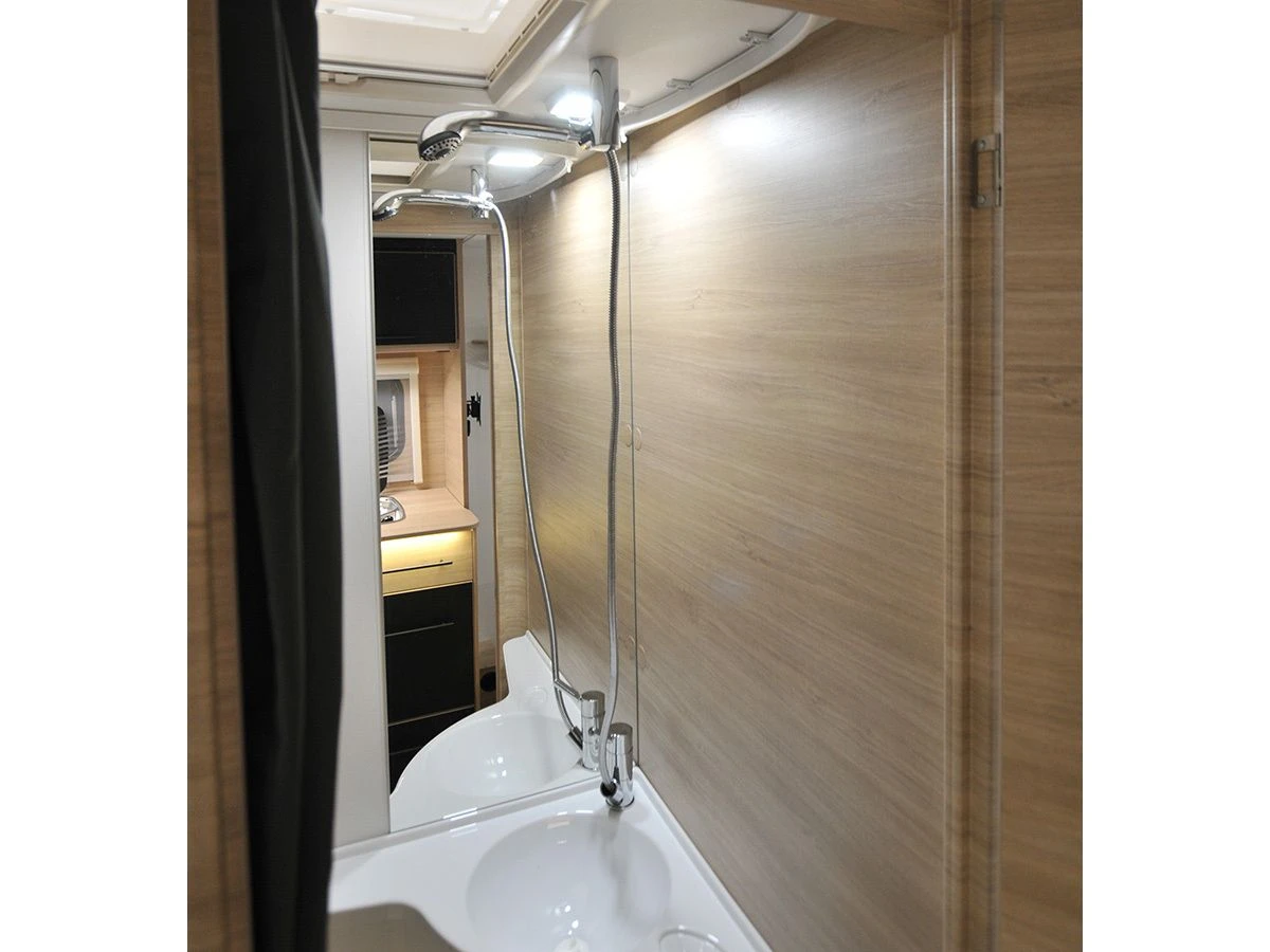 Naast de treinzit is de keuken geplaatst. In deze achterkeuken vindt u een compressor koelkast van 150 liter, een 3-pits kooktoestel en spoelbak uit RVS met een glazen afdek voor meer werkruimte. De toiletruimte bevindt zich naar het midden van de caravan. Deze ruimte is voorzien van een douchekolom, handdouche, douchegordijn en een elektrisch cassettetoilet.