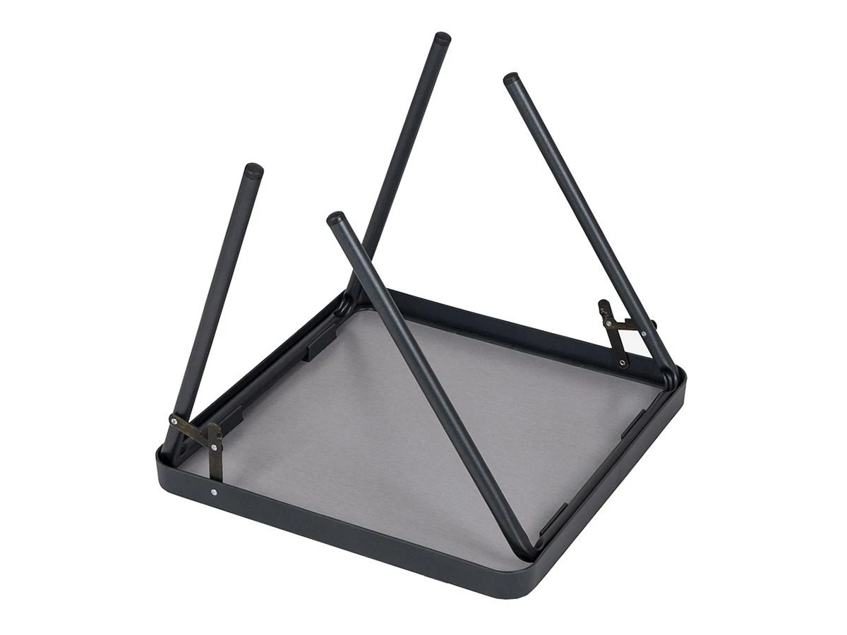 Het tafelblad is gemaakt van melamine, wat hittebestendig en watervast is, en daardoor zeer geschikt is voor wisselende weersomstandigheden. De aluminium poten in een stijlvol grijze afwerking zorgen voor extra stevigheid.