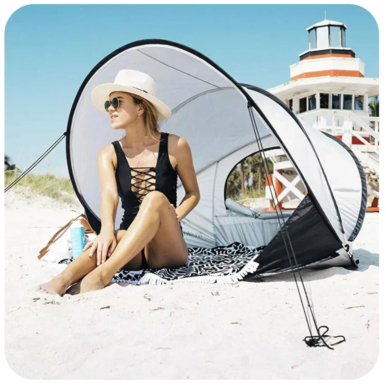 De XXL strandtent heeft een hellend ontwerp waardoor hij ook in de zon geplaatst kan worden. De pop-uptent is ontworpen met een snel in- en uitklapmechanisme. De tent heeft aan de achterkant lussen om de DERYAN tent vast te zetten met haringen, en hij heeft vakken om de stevigheid in het zand te optimaliseren. Ook is de tent groot genoeg om hem met het gehele gezin te gebruiken.