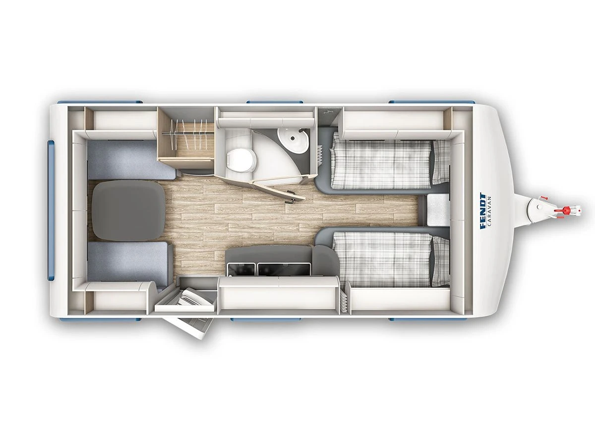 De Apero 465 TG is voorzien van een treinzit, middenkeuken, middentoilet en twee enkele bedden.