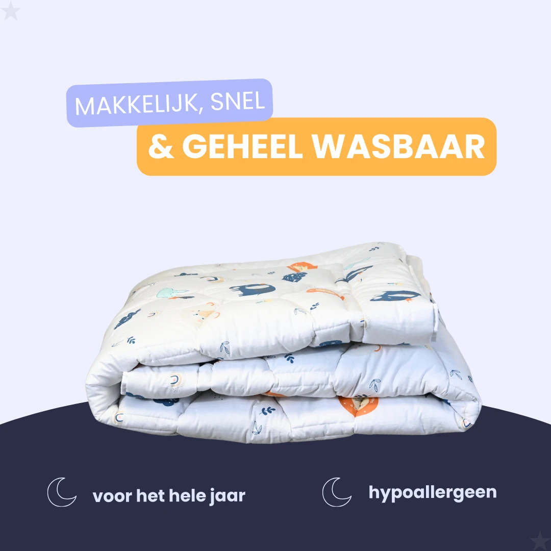 Speciaal voor drukke moeders: dit dekbed is hypoallergeen en daarmee ideaal voor kindjes met allergieën. Bovendien is het makkelijk uitwasbaar en droogt het supersnel binnen 1 tot 2 uur, zodat je bedje snel weer fris is. Perfect voor wanneer er een ongelukje gebeurt of als je gewoon houdt van een fris bedje voor je kleintje.