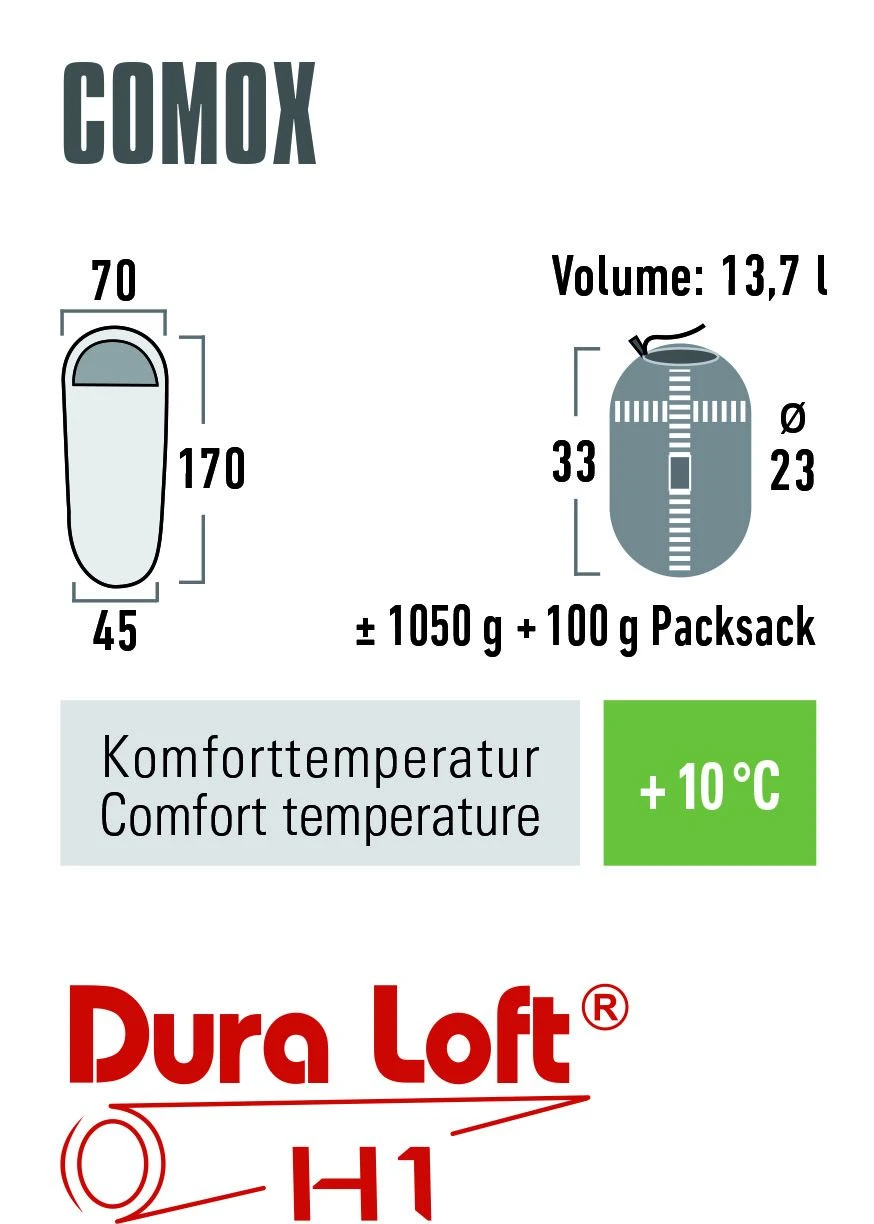 De zachte buitenstof is geïmpregneerd met BIONIC-FINISH®ECO. Deze water- en vuilafstotende technologie is PFC-vrij, milieuvriendelijk en duurzaam. De Comox heeft ook een ademende en huidvriendelijke voering en een hoogwaardige Dura Loft vulling met hoge isolatiewaarde. Dura Loft H1 is duurzaam, makkelijk comprimeerbaar, houdt de warmte vast zelfs in vochtige omstandigheden en droogt snel.