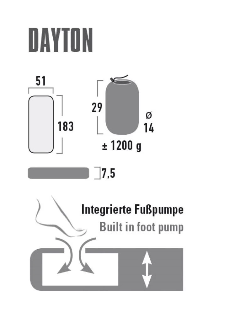 Comfort luchtbed Dayton XL avec geïntegreerde pomp. Het extra lange en brede luchtbed heeft een geïntegreerde voetpomp waardoor het zeer eenvoudig en snel op te pompen is. Het is compact opvouwbaar en mee te nemen in de meegeleverde foedraal. De Dayton XL heeft 23 horizontale luchtkamers die voor een optimale gewichtsverdeling en maximaal slaapcomfort zorgen. Dit luchtbed staat garant voor een zeer goede isolatie tussen grond en slaapzak.