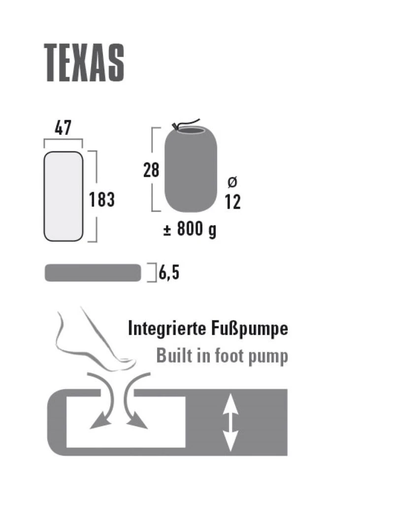 De trekking mat Texas is een lichtgewicht luchtbed met een zeer kleine pakmaat wat hem uiterst geschikt maakt om mee te nemen als je op reis gaat. Het luchtbed heeft een geïntegreerde voetpomp waardoor het zeer eenvoudig en snel op te pompen is. Het is compact opvouwbaar en mee te nemen in de meegeleverde foedraal. Dit bed heeft een isolerende werking.