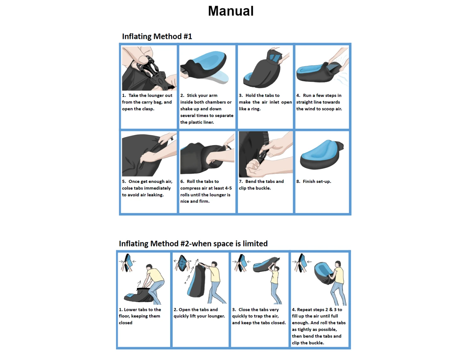 Air Loungers hebben geen luchtventiel en kan je dus ook niet opblazen middels een luchtpomp of je mond. Daarentegen vul je handmatig de Air Lounger met lucht door ermee achtjes te draaien in de lucht of door een stukje te rennen, waarna de wind de Air Lounger met lucht vult. Zie de handleiding voor nadere informatie over hoe deze Air Lounger te gebruiken.
