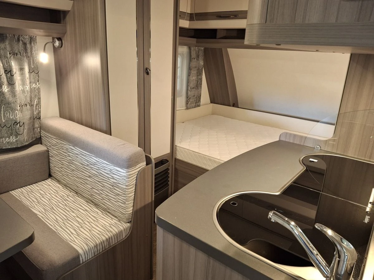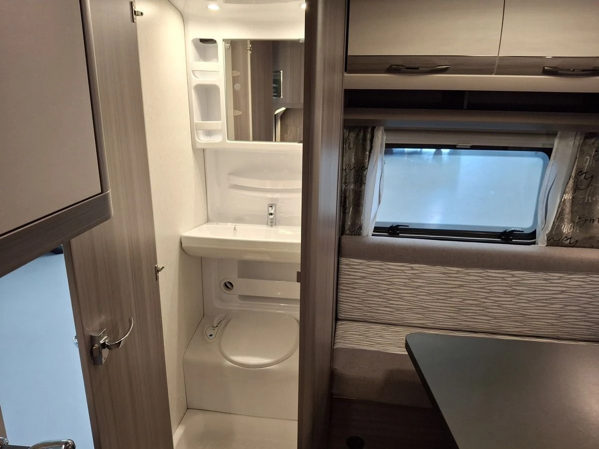 | Caravan indeling | Achter toilet, Middenkeuken, Slaapbank, Treinzit, Dwars bed, Hoek toilet, Kledingkast |
