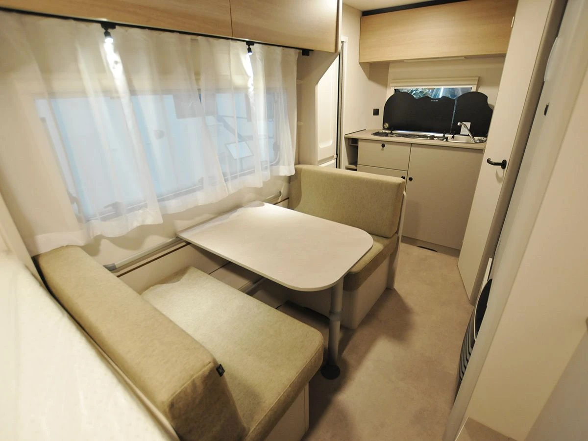 | Caravan indeling | Achter toilet, Eindkeuken, Middendinette, Slaapbank, Dwars bed |
