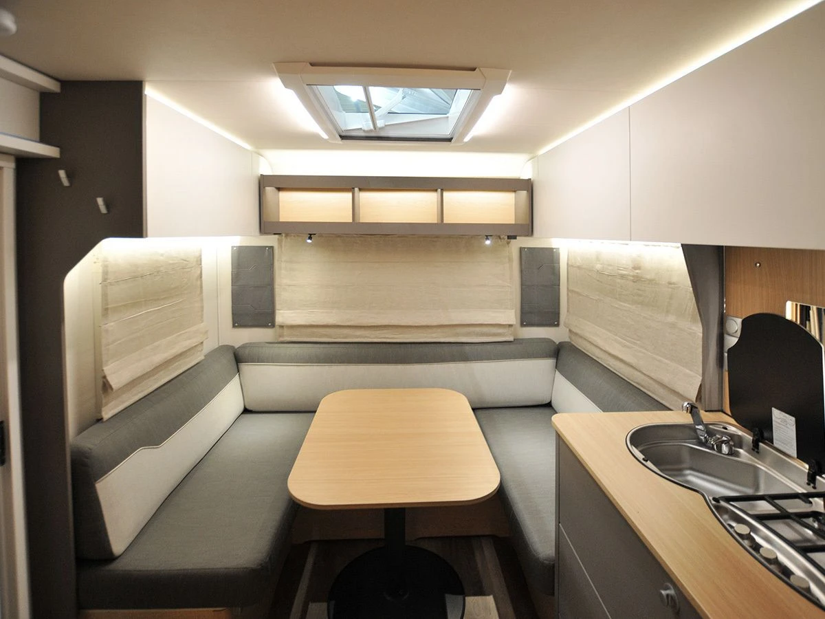 De keuken in de LMC Tandero 480 D caravan is uitgerust met een kookplaat, een compressor koelkast en een gootsteen, alles in een slimme, ruimtebesparende opstelling. De compressor koelkast biedt energie-efficiëntie en is in staat om snel en gelijkmatig te koelen, zelfs bij hogere buitentemperaturen, waardoor je voedsel langer vers blijft. Dit maakt het gemakkelijk om zelf maaltijden te bereiden, zelfs op langere reizen. De caravan biedt dus alles wat je nodig hebt voor een zelfvoorzienende campingervaring.