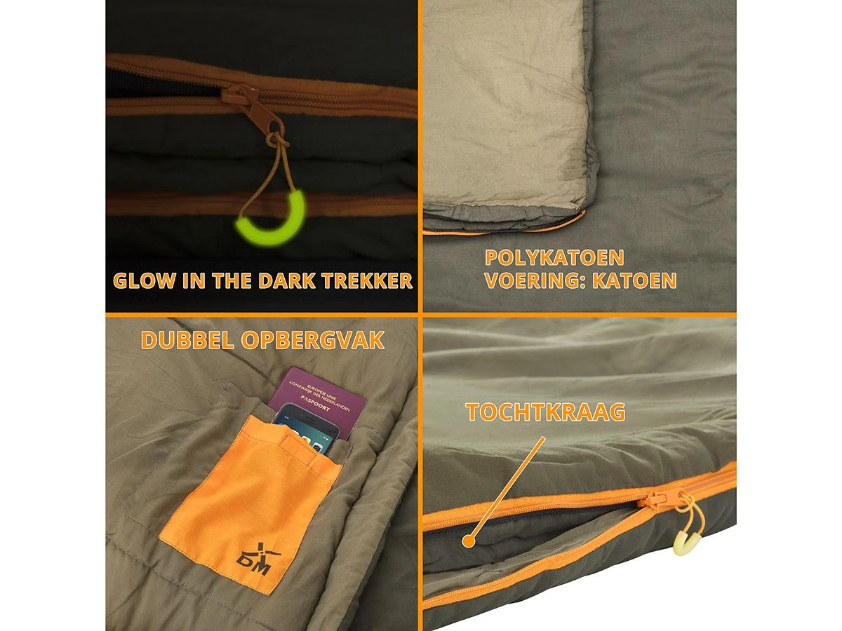 Ook de ‘Vlieland’ is door Dutch Mountains van allerlei slimme nuttigheden voorzien. Berg je paspoort of telefoon veilig op in de twee klittenbandvakken in de slaapzak. En wat dacht je van glow in the dark zippers? Nooit meer op zoek naar je zipper in het donker en bovendien blijft je rits dicht als je draait in je slaap omdat de zippers zijn uitgerust met zip-stop. Rits trouwens ook gerust twee ‘Vlieland’s’ aan elkaar. De ritsen zijn er klaar voor!
