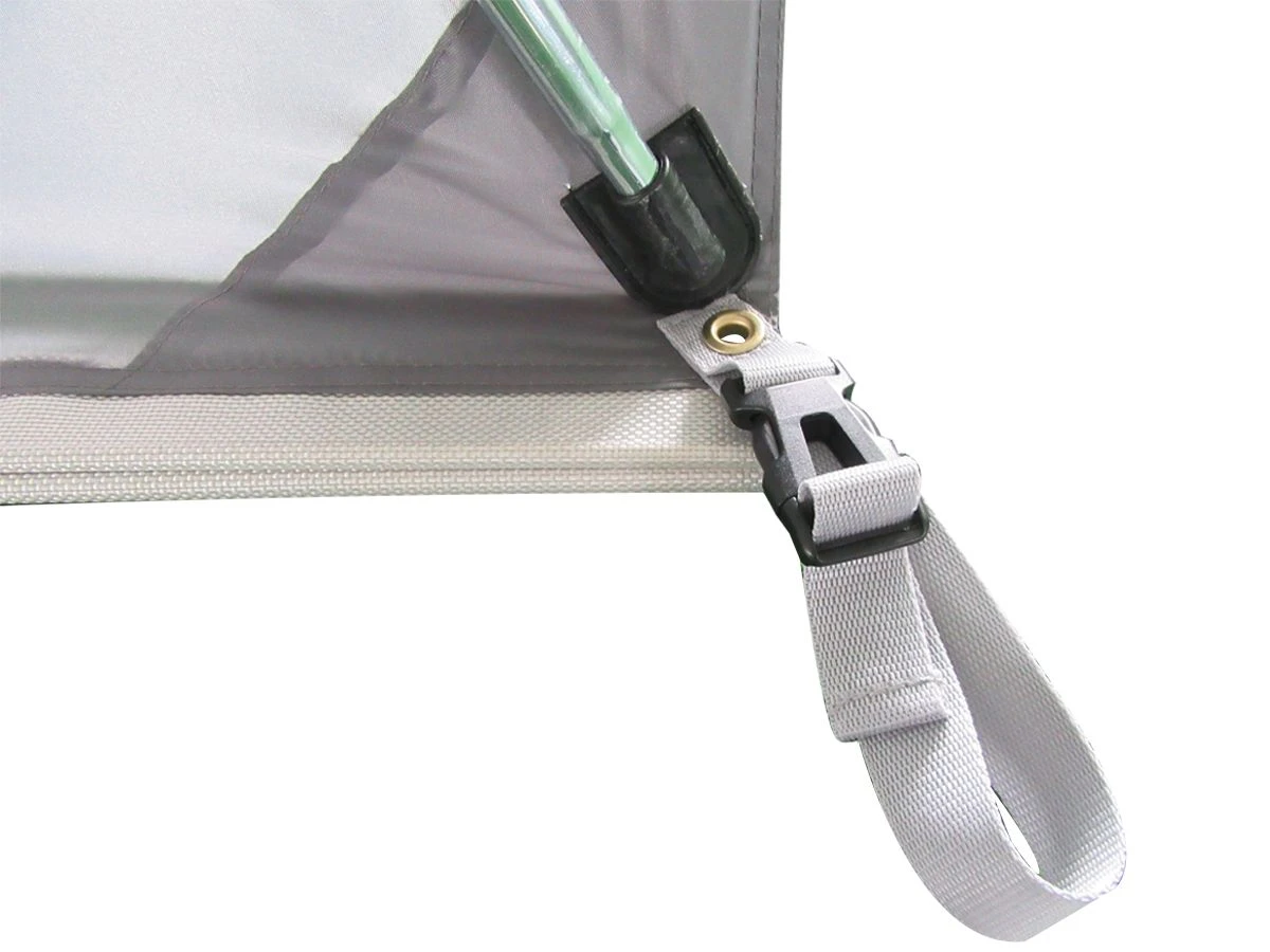 De Obelink Elbe is een koepelvormige luifel die voorzien is van 3 glasfiber boogstokken. Dankzij de diverse bevestigingsmogelijkheden kun je de Elbe op verschillende manieren gebruiken in verscheidene situaties en voor alle kampeermiddelen. Zo zijn de vier hoeken voorzien van ogen waar je staanders in kunt bevestigen. Standaard wordt de luifel met 2 luifelstaanders geleverd. Verder is de Elbe aan één zijde voorzien van bevestigingsbandjes, een 5 mm pees en een 7 mm pees. Met de bevestigingsbandjes kun je Elbe bijvoorbeeld bevestigen aan een dakrail of een imperiaal en met de pezen kun je de luifel eenvoudig in een cassetteluifel of tentrail schuiven.