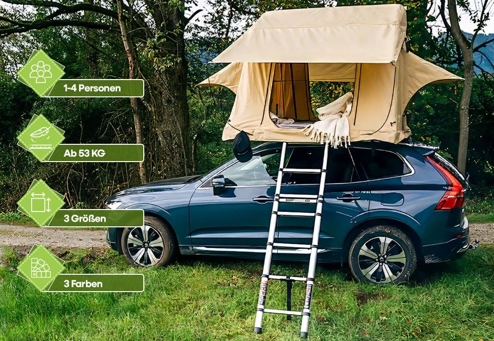 Onze Expedition daktent is de perfecte keuze voor avontuurlijke outdoorfans die de grote stad en hun afspraken snel en gemakkelijk achter zich willen laten na een drukke werkweek. Hij is klaar voor onmiddellijk gebruik en maakt indruk met intelligente details en een bijzonder hoogwaardige afwerking. Verkrijgbaar voor 2 of 4 personen – of voor jou en je notebook als “kantoor ver van huis”.