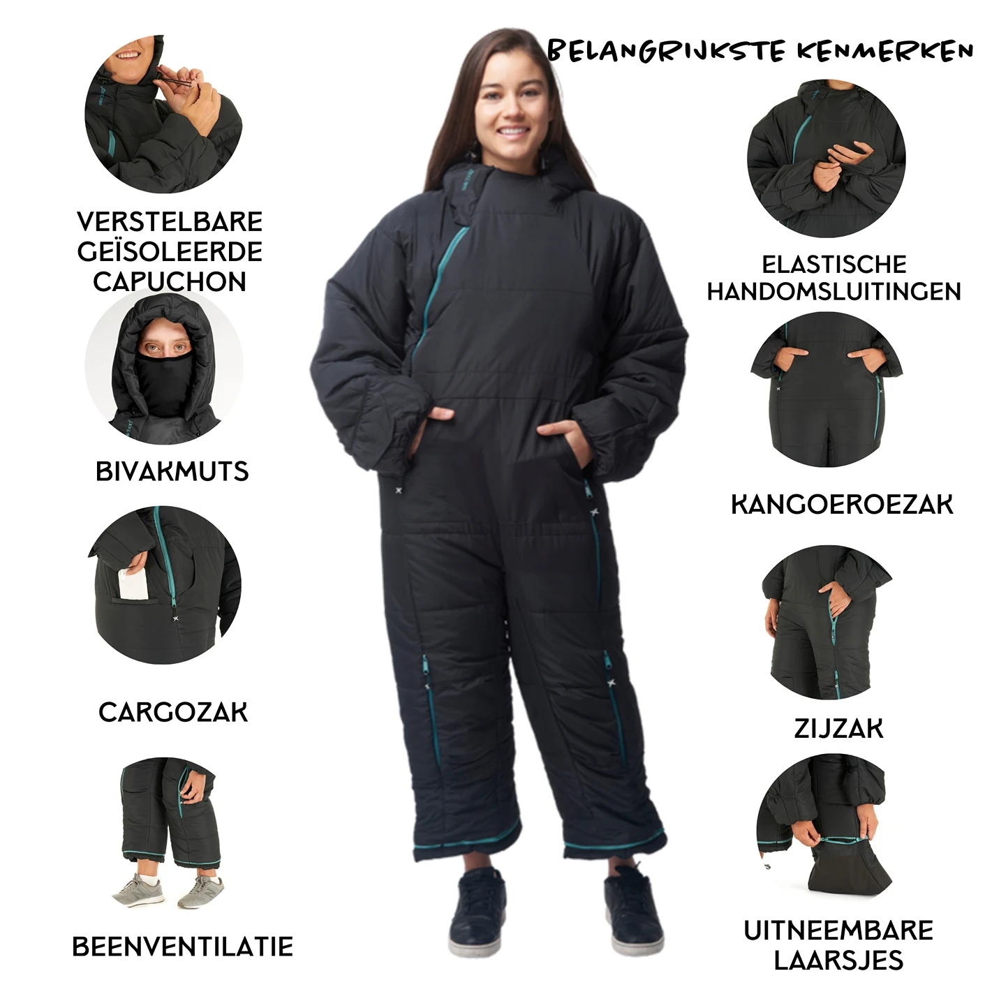 Blijf warm en gezellig in stijl met deze innovatieve slaapzak die het comfort van een slaapzak combineert met de bewegingsvrijheid van een traditioneel pak. Het ontwerp van de slaapzak heeft veel te bieden voor een topervaring. Het heeft elastische handomsluitingen voor gemakkelijke toegang, een kangoeroe-stijl zak voor het gemak, en een verstelbare geïsoleerde capuchon voor optimale pasvorm en warmte. De afneembare sloffen bieden flexibiliteit in schoeiselkeuze, terwijl een cargozak en zij-ingang extra opslagruimte en functionaliteit bieden. Beenventilatieopeningen helpen de temperatuur te reguleren tijdens activiteiten, waardoor het een praktische keuze is voor verschillende buitenactiviteiten.
