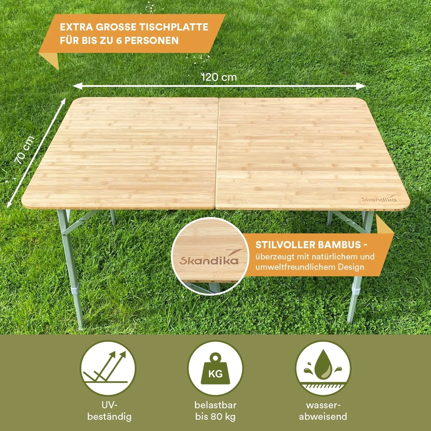Kamperen kan ook stijlvol zijn. Het aantrekkelijke en milieuvriendelijke bamboe tafelblad geeft de Tolja klaptafel een natuurlijke uitstraling en tegelijkertijd een bijzonder elegante en hoogwaardige uitstraling. Dit betekent dat er geen compromissen worden gesloten als het gaat om het ontwerp tijdens het kamperen.