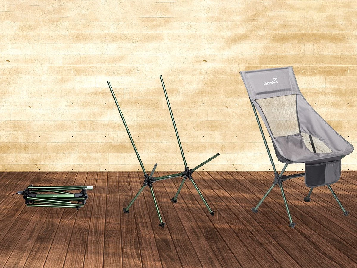 Het slimme bungeesysteem van het hoogwaardige aluminium frame houdt alle onderdelen bij elkaar. Er raakt niets kwijt en de montage is supersnel en supergemakkelijk – zonder gereedschap. Tenslotte hoeft je alleen nog maar de stof van de stoel erover te spannen.