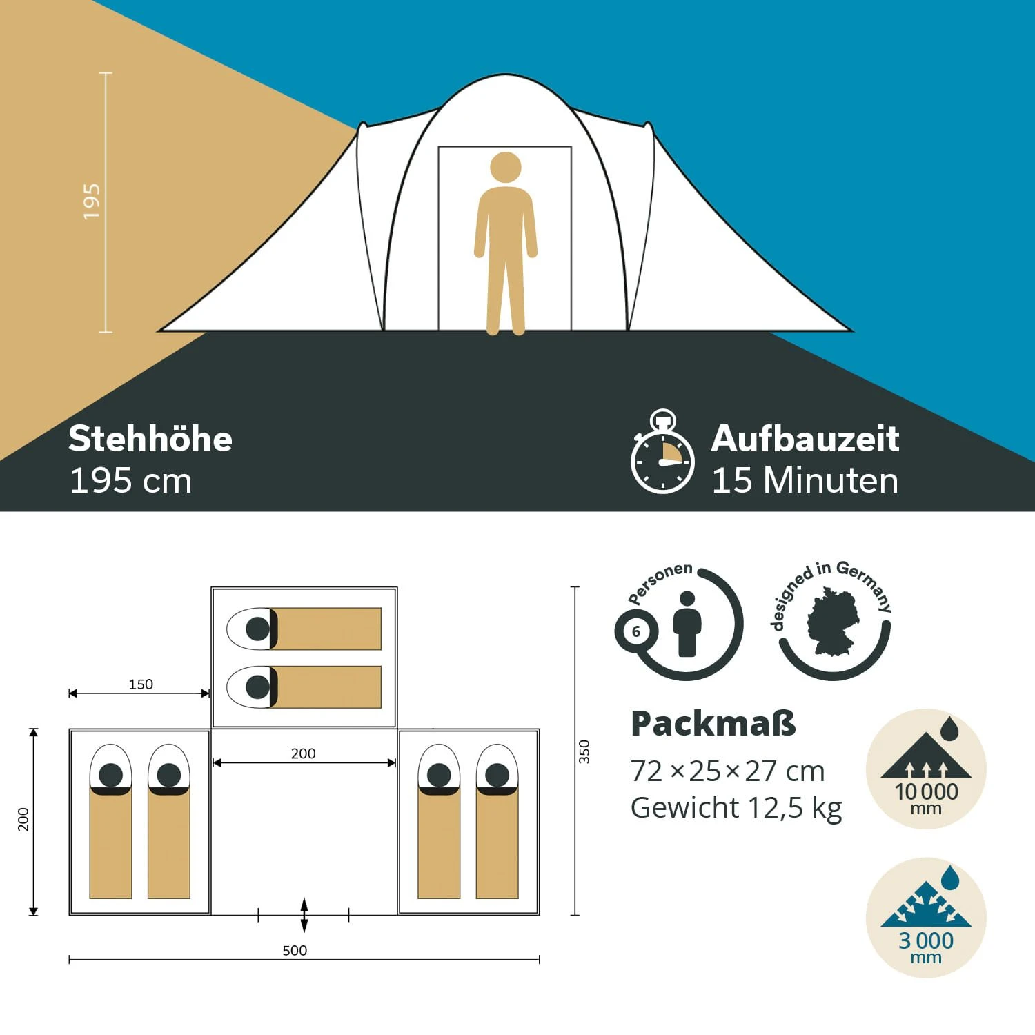 Met een comfortabele stahoogte van 195 cm, veel ruimte in het woongedeelte voor bagage en vrienden en drie binnententen voor een verkwikkende nachtrust.