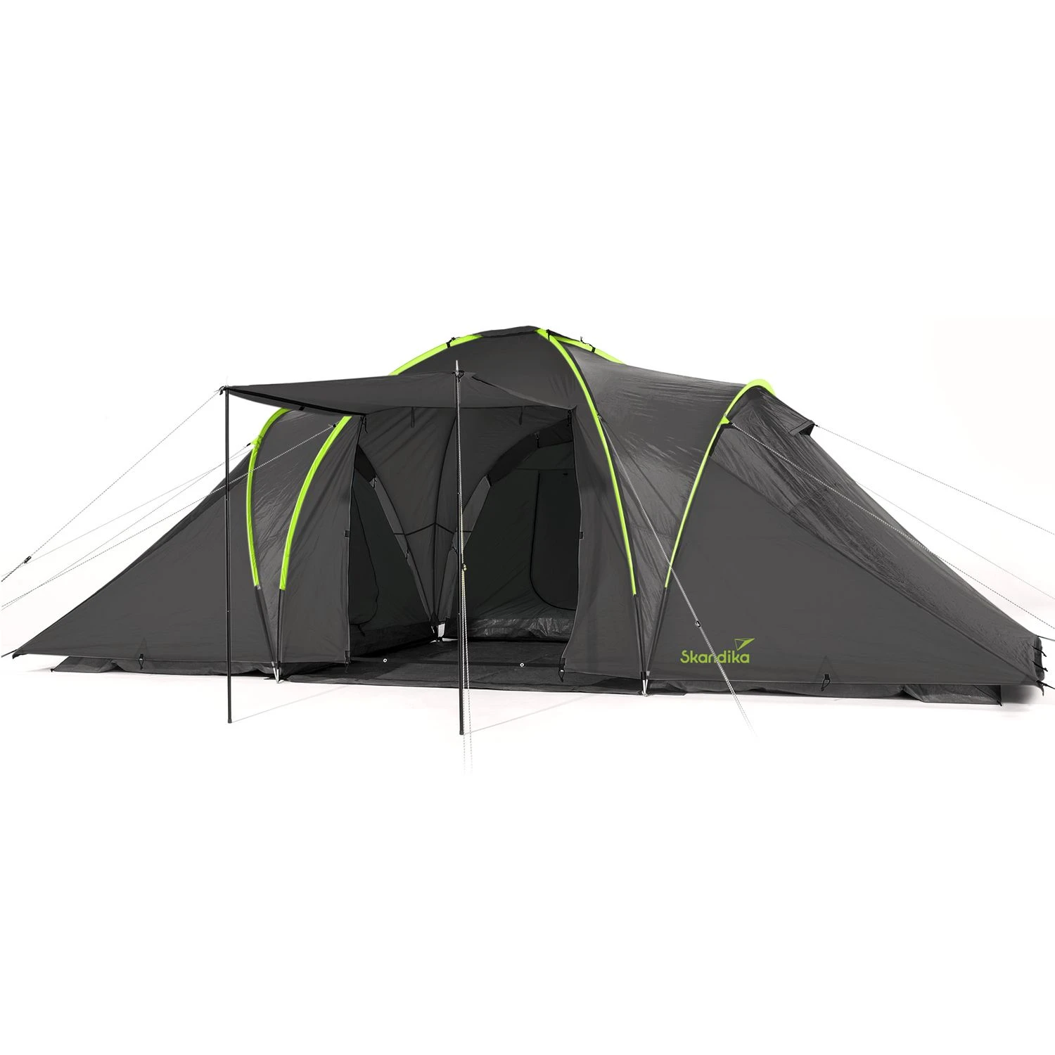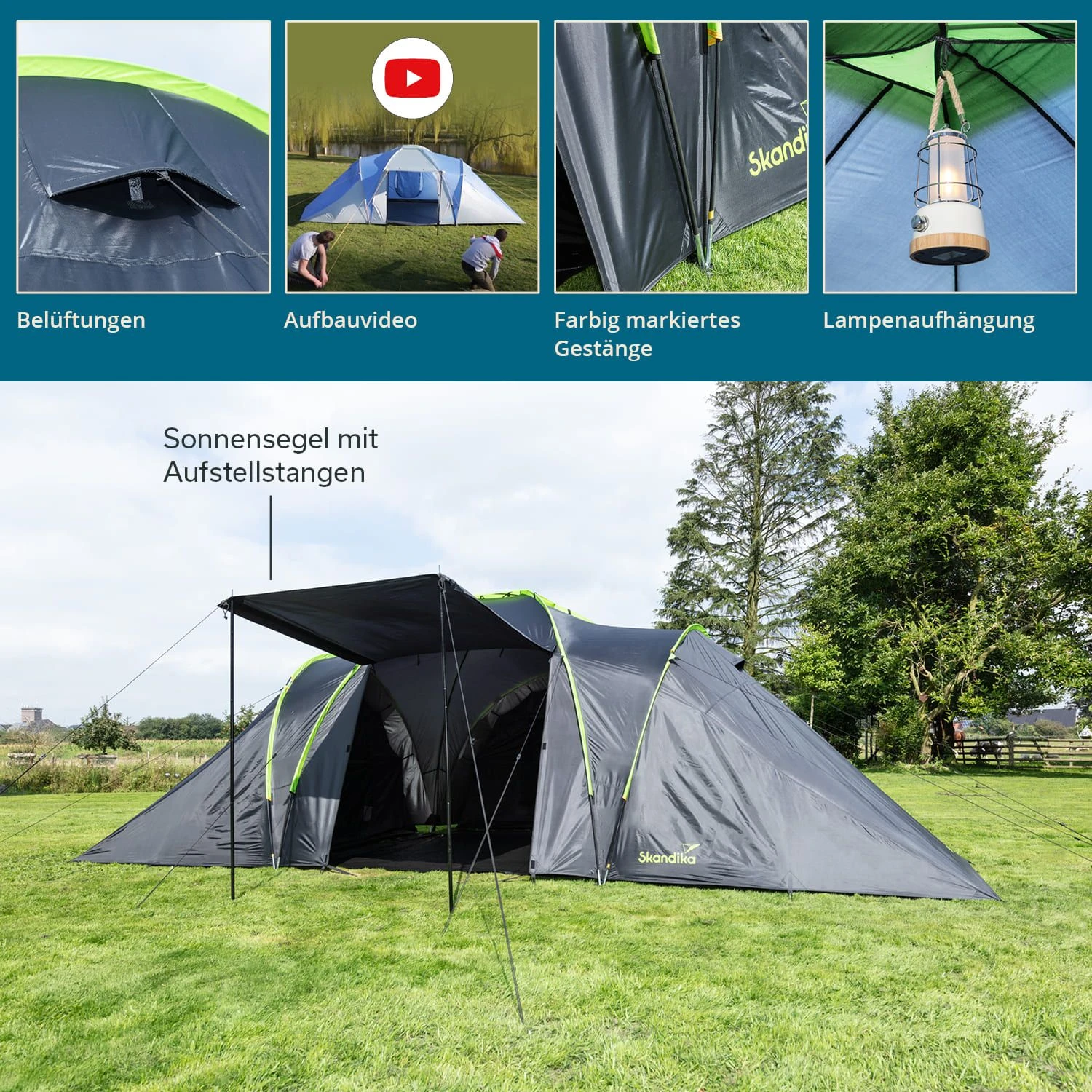 Goed ontworpen familietent met veel functionele extra’s zoals lampophanging, ventilatieopeningen en een ingang die als zonneluifel kan worden gebruikt.