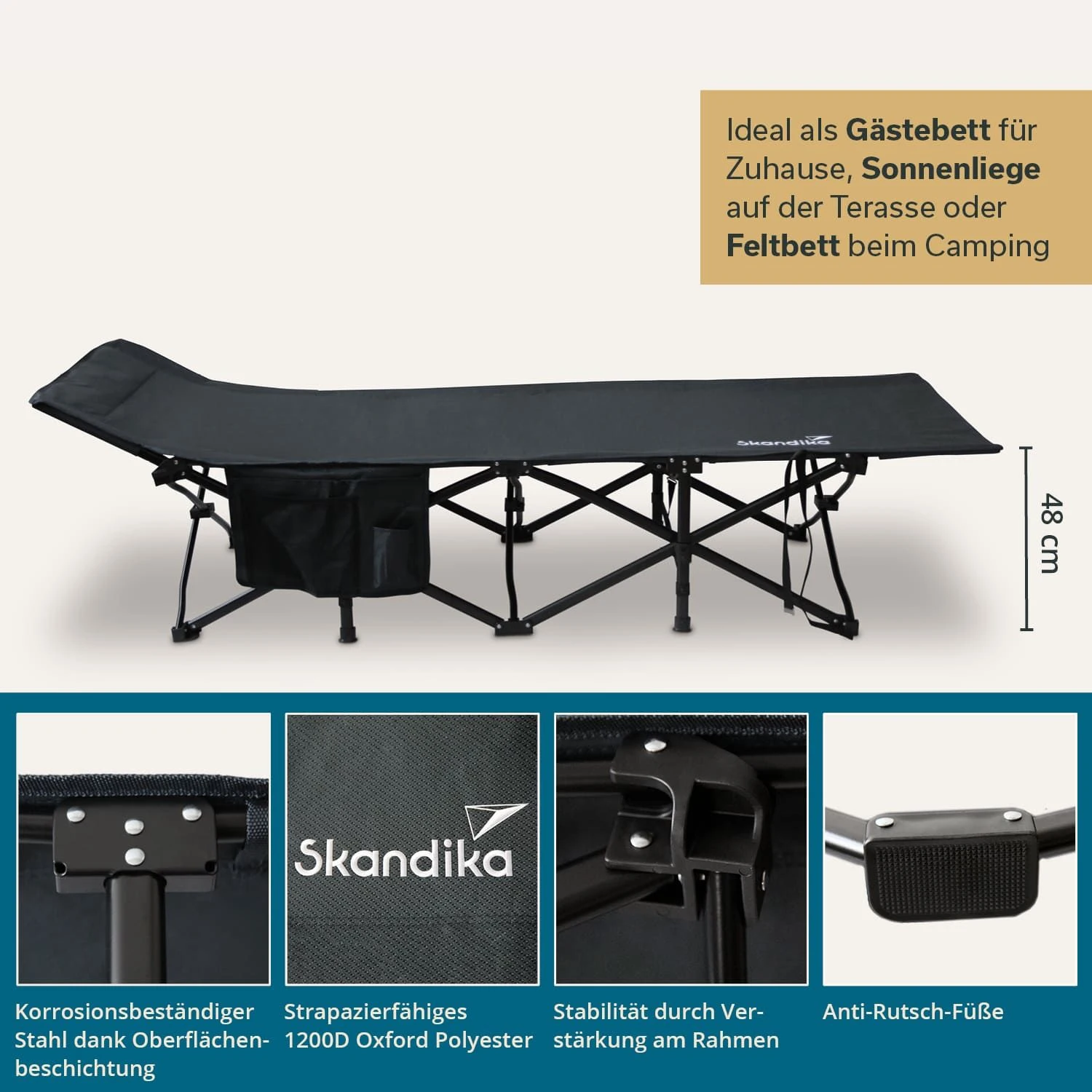 De stevige stalen constructie staat dankzij de antislipvoeten ook op oneffen en natte ondergrond stevig en stevig en verleent het campingbedje een maximale belasting tot 150 kg.
