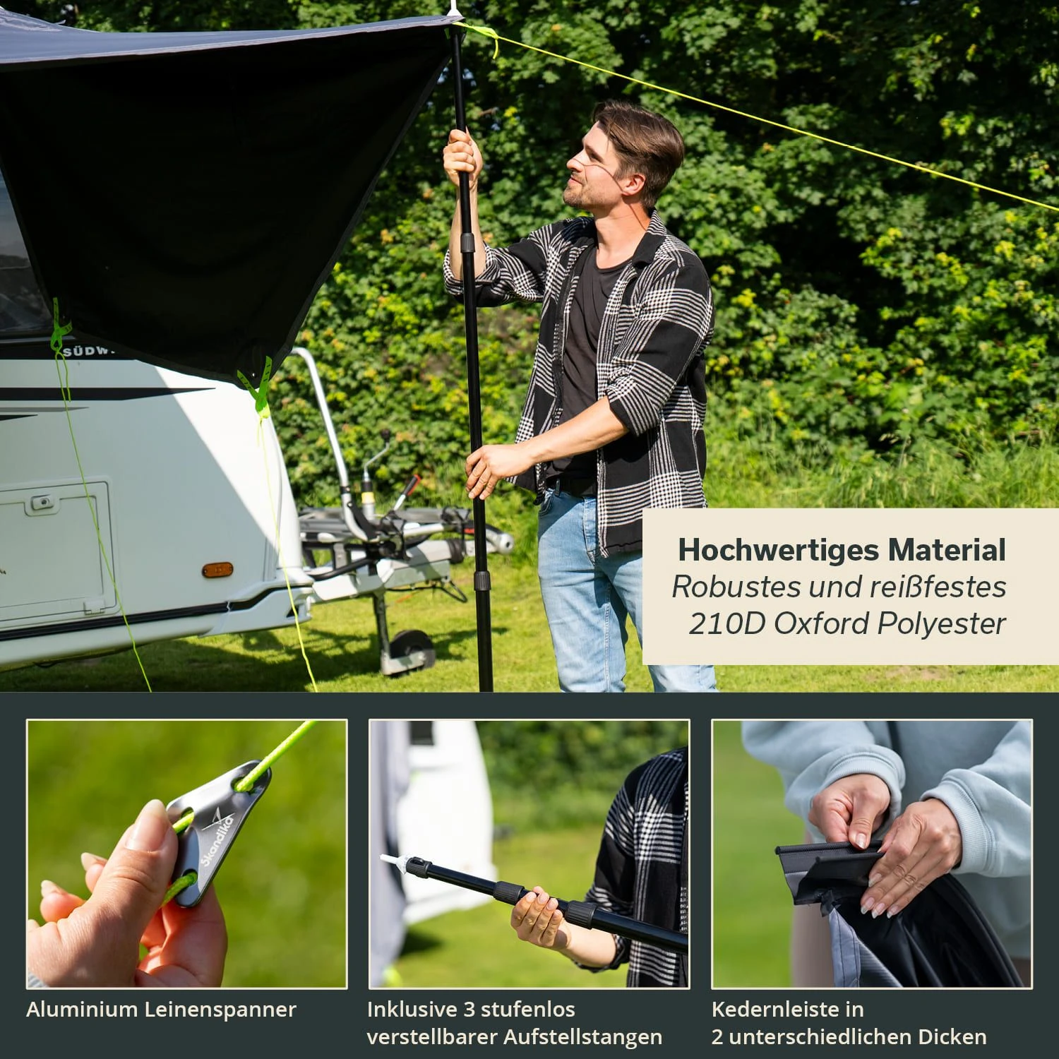 De intelligente luifel van weerbestendig 210 D Oxford polyester met een waterkolom van 3.000 mm is veilig en sterk, zelfs bij regen en harde wind. Bij hoge temperaturen en intens zonlicht scoort hij punten met zijn UV-beschermingsfactor 50+. Deze speciale stofbehandeling voorkomt dat de luifel broos wordt of barst, wat een belangrijke bijdrage levert aan de levensduur. De neonkleurige bevestigingskoorden zijn duidelijk zichtbaar en verminderen het risico op struikelen. En na je vakantie kun je alles veilig opbergen en vervoeren in de stevige draagtas.