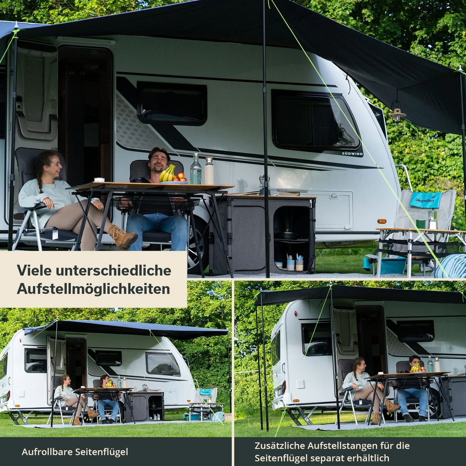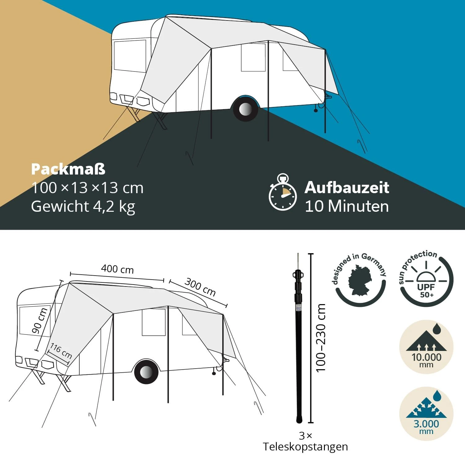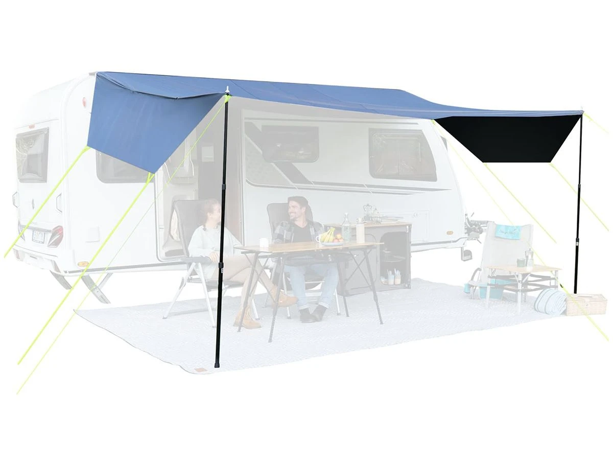 Een droge opbergruimte voor schoenen, uitrusting enzovoort vergroot de beschikbare ruimte in de caravan aanzienlijk. Het dak biedt ook een beschutte plek voor maaltijden of om comfortabel in de buitenlucht te zitten.