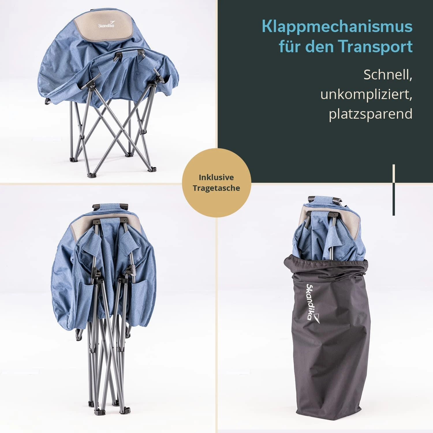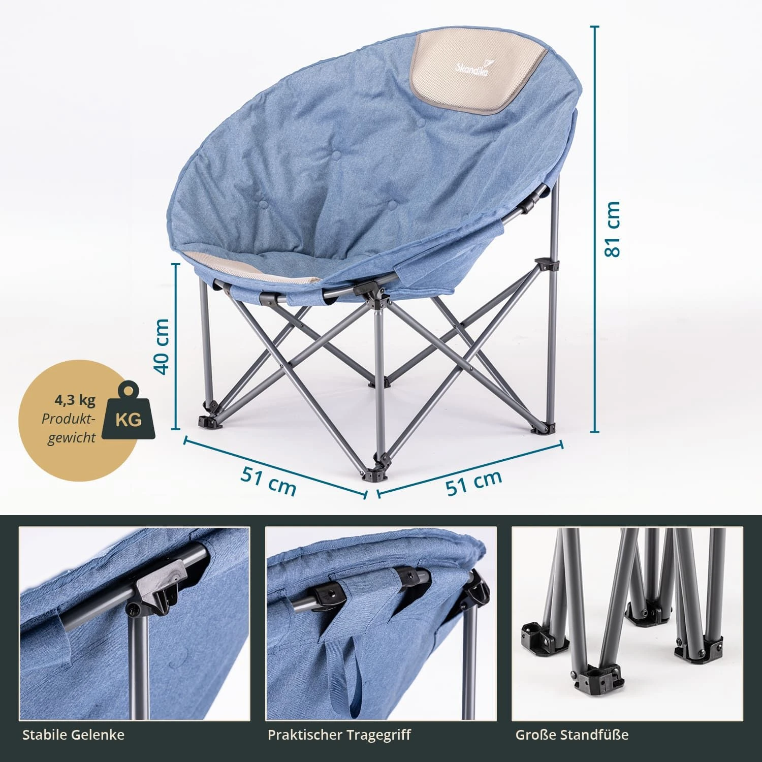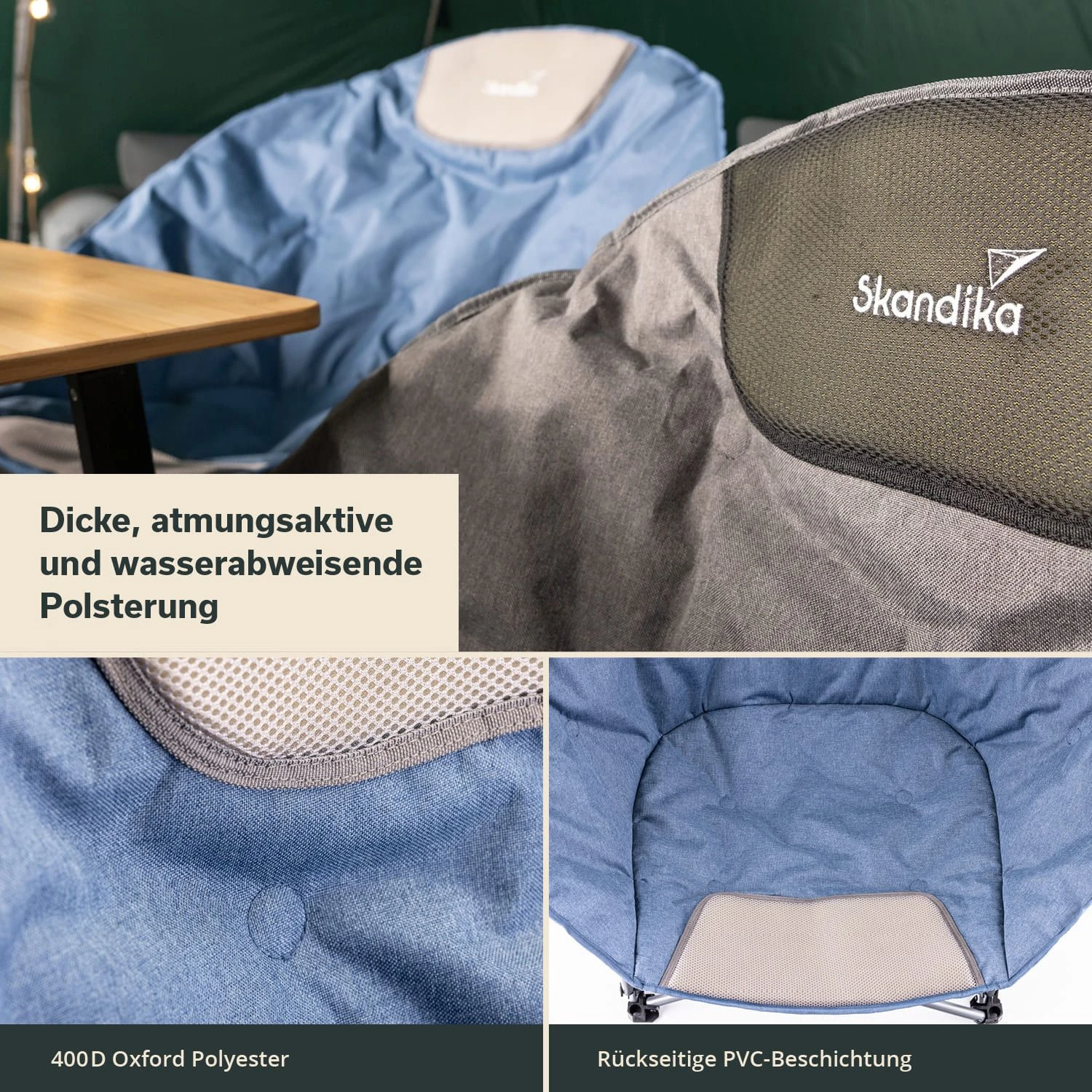 De grote, ronde zitting is aangenaam zacht gestoffeerd en het slijtvaste materiaal is ook gemakkelijk schoon te maken – gewoon afnemen met een vochtige doek en de campingstoel ziet er weer fris uit.