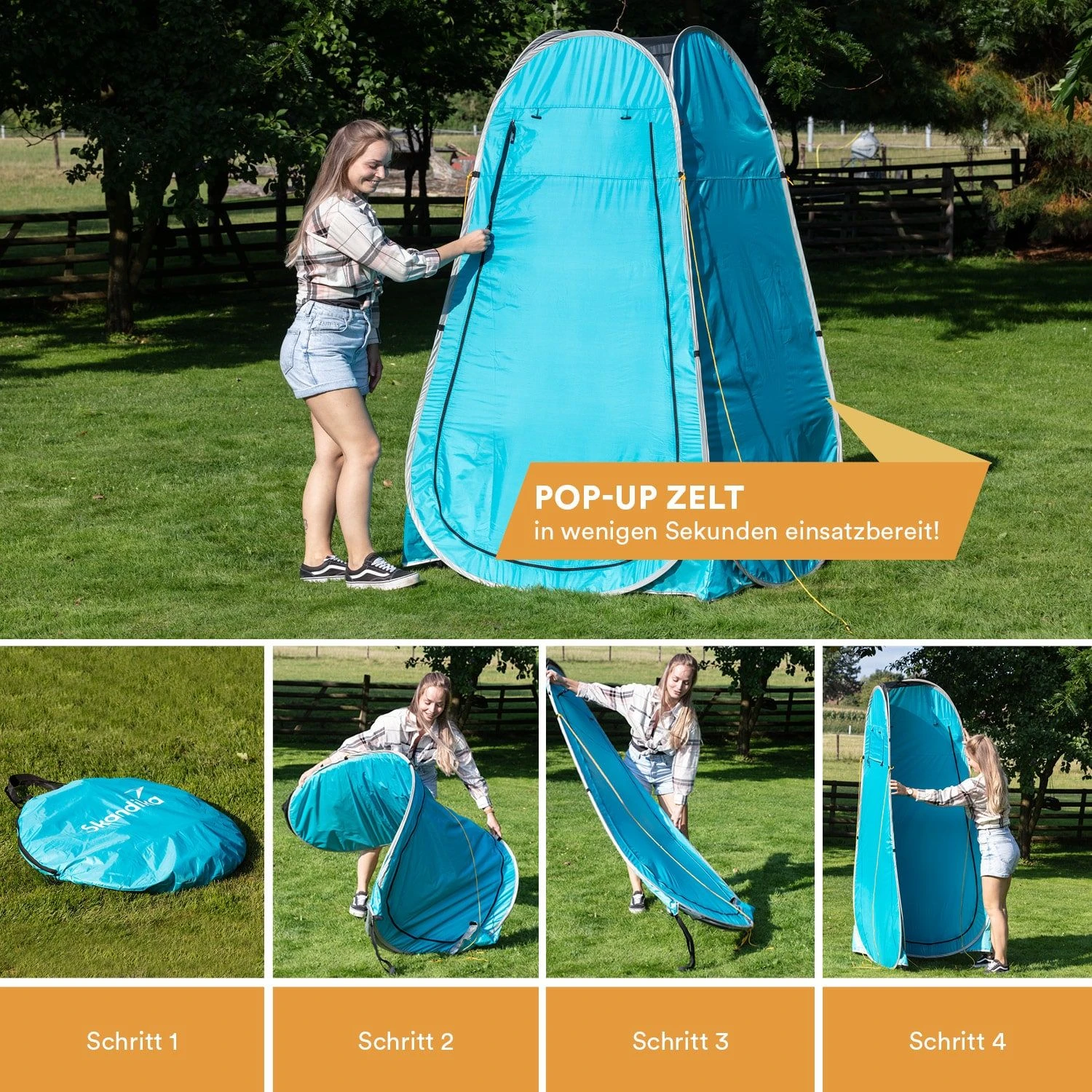 Als de tent niet direct bij de sanitaire voorzieningen op de camping moet worden opgezet, is de multifunctionele douchetent van Skandika in pop-up uitvoering een super oplossing. Of het nu als douchetent of als toiletcabine is, deze tent is er perfect voor en maakt zelfvoorzienend leven makkelijker op elk kampeeravontuur.