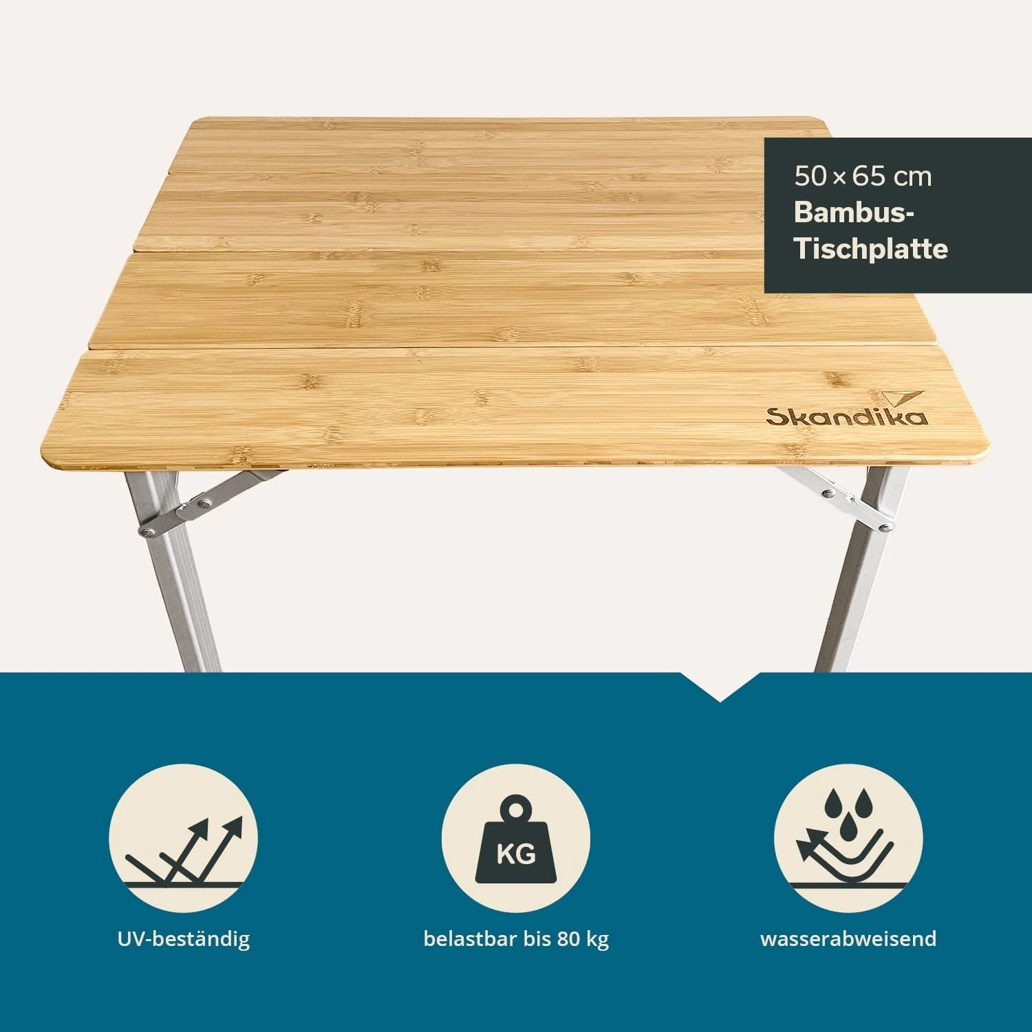 Zelfs het bamboe tafelblad van deze klaptafel kan worden ingeklapt (de 4 segmenten worden gewoon op elkaar geklapt) zodat het pakformaat uiterst compact en handig is voor transport. Twee dwarsbalken onder het tafelblad zorgen voor extra stabiliteit bij het opzetten, waardoor de tafel tot 80 kg kan dragen en slechts 4,5 kg weegt.