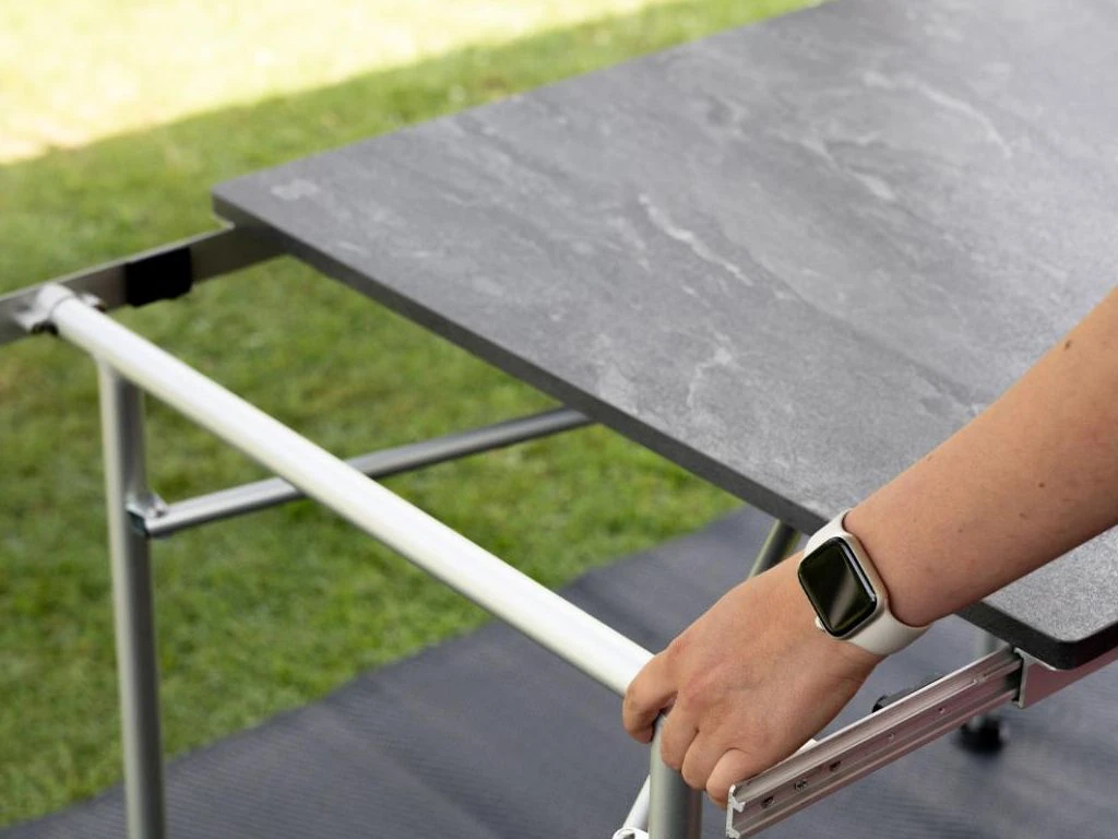 Ga je met een grote groep kamperen, maar beschik je over weinig ruimte? Of heb je graag lekker veel ruimte aan tafel? De Sorrento tafel verleng je eenvoudig door de losse delen uit te schuiven. Hierdoor beschik je over een grote tafel, maar dankzij zijn compacte formaat neemt hij niet veel plek in in jouw caravan, camper of auto. De tafel is uitschuifbaar van 80 cm tot 110 cm of 140 cm. De tafel beschikt over een extreem lichtgewicht honeycomb tafelblad, die kras- en hittebestendig tot 120 °C is. Daarbij is de tafel in hoogte verstelbaar door middel van snel aansluitingen. Je bepaalt dus zelf de gewenste lengte en hoogte van de tafel. Zo kan iedereen gezellig aanschuiven.