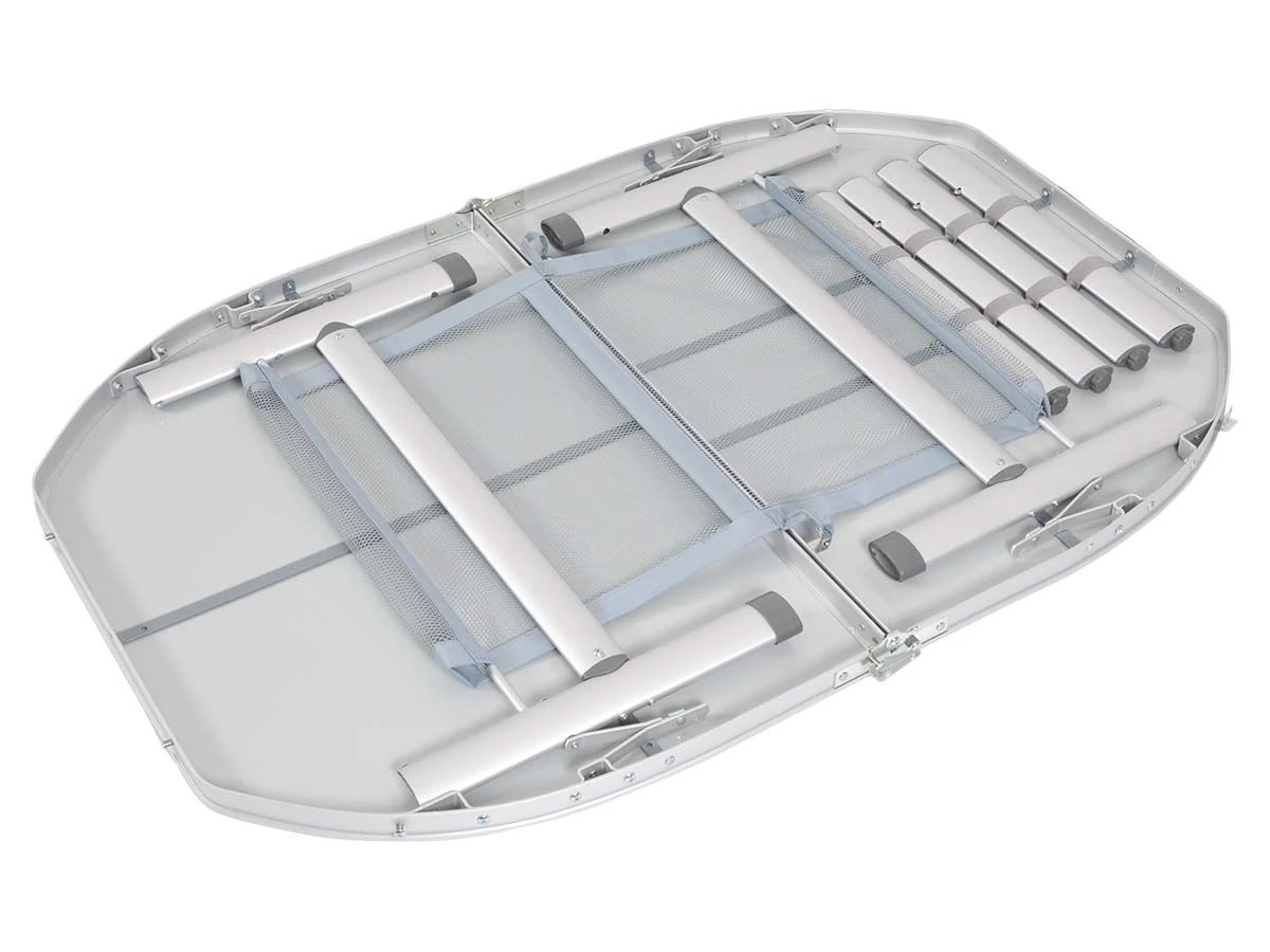 Onder het blad zit een handig lectuurnet zodat je altijd je boek of tijdschrift in de buurt hebt. Na gebruik is de tafel compact op te vouwen, door het deelbare blad kun je de tafel inklappen als een koffer.