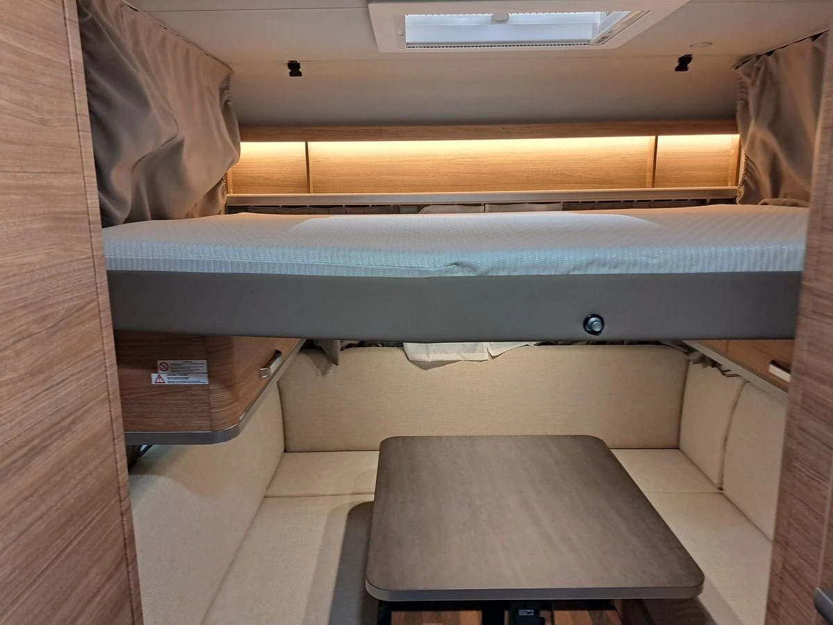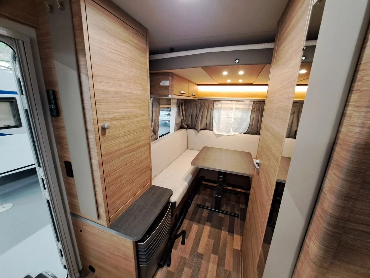 | Caravan indeling | Kopkeuken, Midden toilet, Slaapbank, Bovenbed, Rondzit |