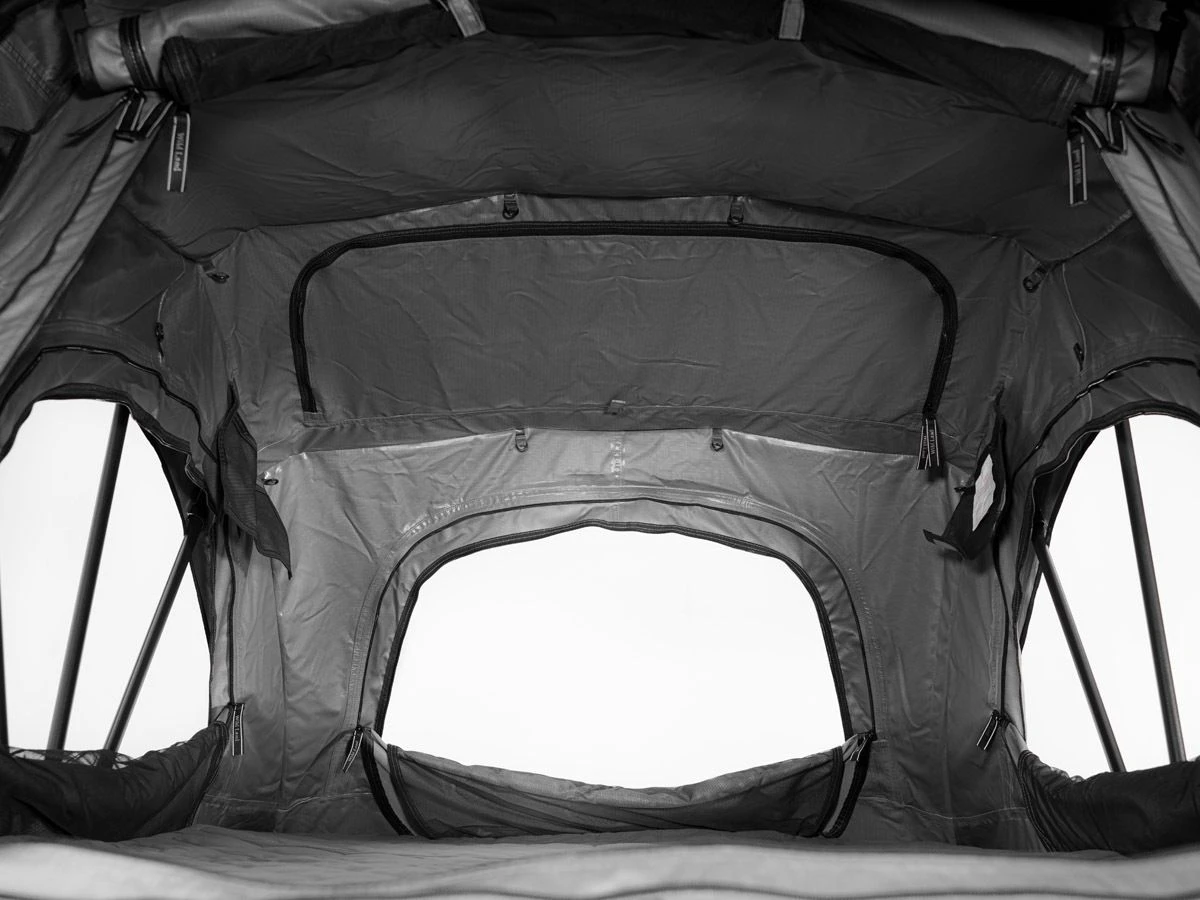 De Lite Cruiser is eenvoudig in en uit te klappen. Je gebruikt de geïntegreerde ladder namelijk ook als hefboom om de tent op te klappen. De ladder dient tevens als ondersteuning voor het frame. De Lite Cruiser is rondom voorzien van grote gaaspanelen die van binnenuit afgedekt kunnen worden. Dankzij de lichte ronding in het dak loopt regenwater eenvoudig van de tent af en heb je geen last van waterzakken.